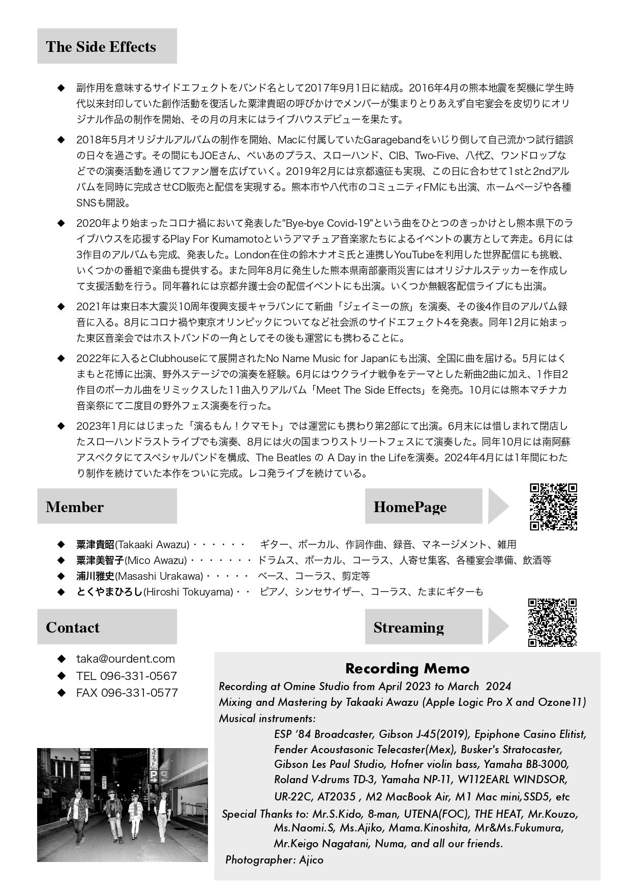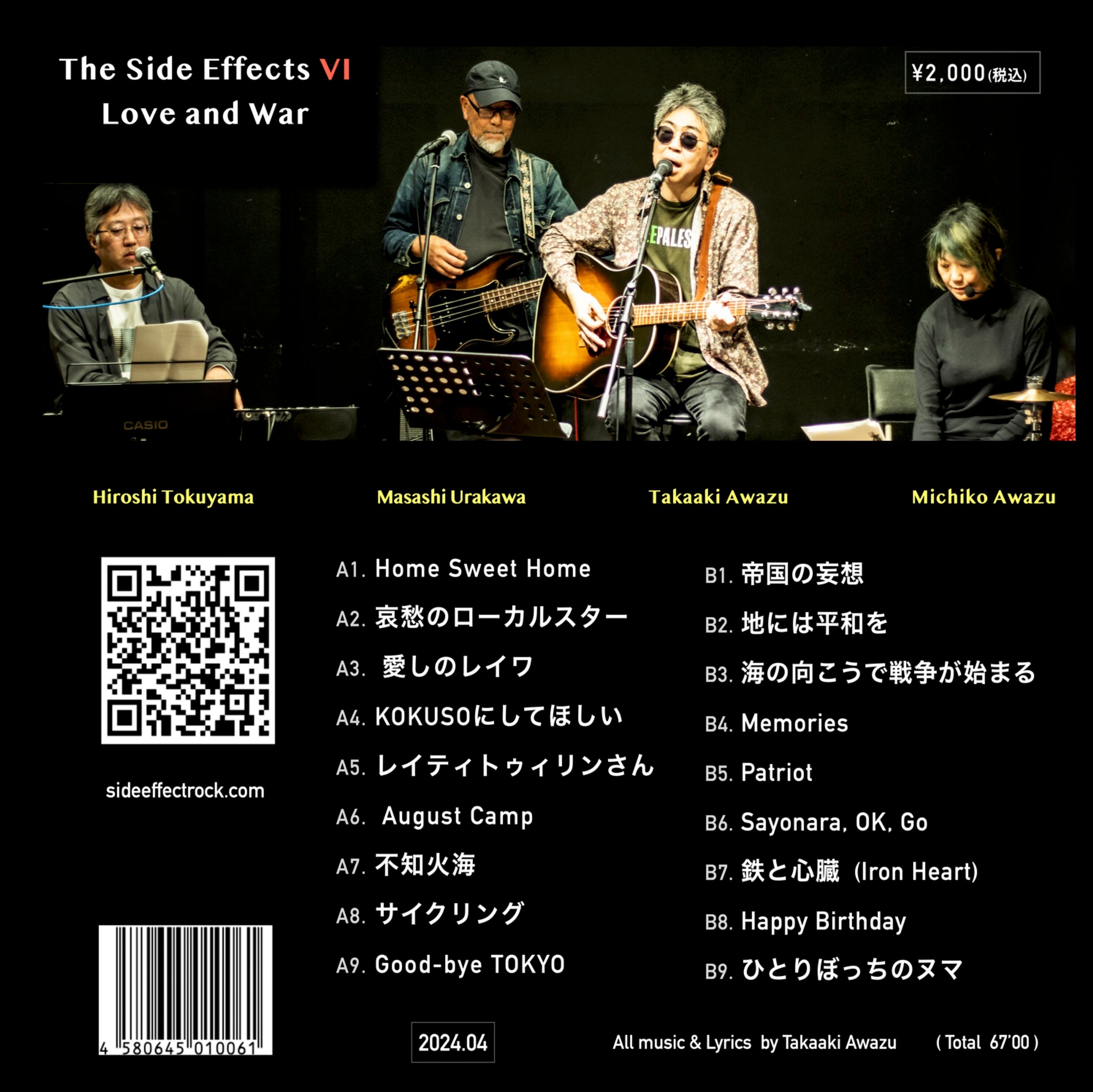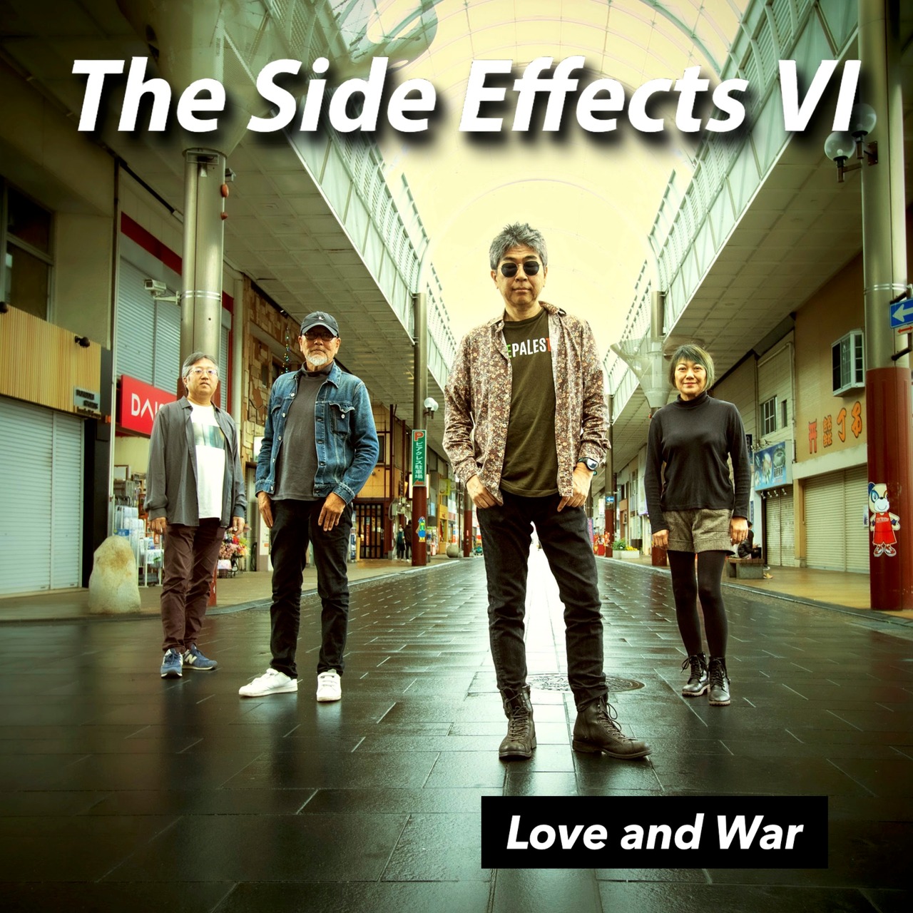 サイド・エフェクト6作目アルバムです。21世紀には珍しいコンセプトアルバムと位置づけ、"Love and War"という副題にしました。前作が2022年6月でしたので2年ぶりの新作となりました。新曲は次々発生していたのですが、なかなか録音とミックスが進まぬままずーっと制作していた2年間でした。その間ウクライナでの戦争に加え中東イスラエルのガザ侵攻、日本では首相暗殺など暗いニュースが続き、このアルバムの収録曲もそれらの影響を如実にうけることとなりました。制作期間の長さはそのまま楽曲数に影響し、気がつけば18曲。LP時代なら2枚組ですが、CDの収録限界ギリギリで1枚に収めることができました。でも気分的には2枚組です。このライナーノーツでもA面B面といった表記で進めていくことにしました。僕らが丹精込めて作った曲たちが皆さんの人生のお供に加わることができたらこんなに幸せなことはありません。